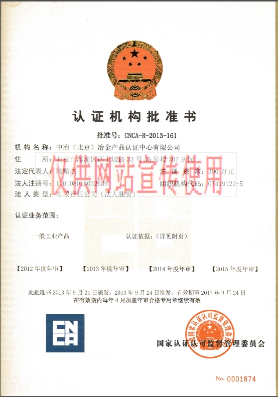 2013年9月,中冶(北京)冶金产品认证中心有限公司由中国国家认证认可监督管理委员会批准设立(批准号CNCA-R-2013-161),主要从事冶金产品的自愿性产品认证工作,也是冶金行业里第一家专业从事认证工作的机构。